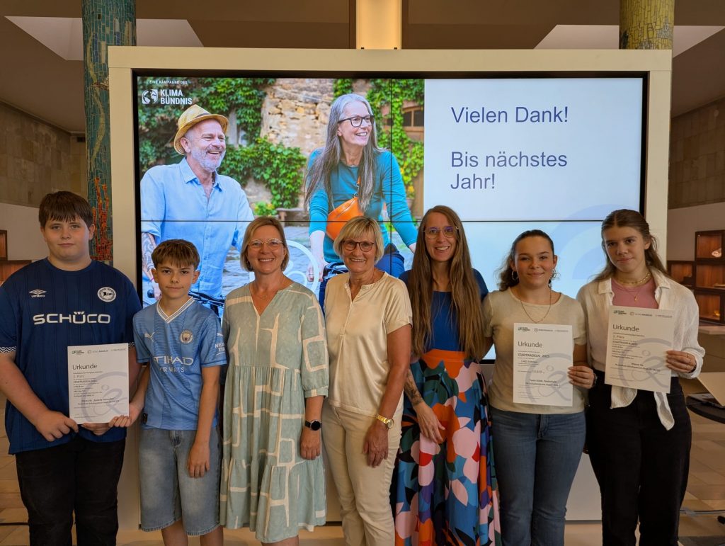 Wie auch in den letzten Jahren haben wieder einige Klassen unserer Schule am Stadtradeln teilgenommen. Mit großem Einsatz und viel Teamgeist traten die Schülerinnen und Schüler in die Pedale, um möglichst viele Kilometer für den Klimaschutz zu sammeln. Besonders erfolgreich war dabei die Klasse 9a. Sie erreichte mit beeindruckender Leistung