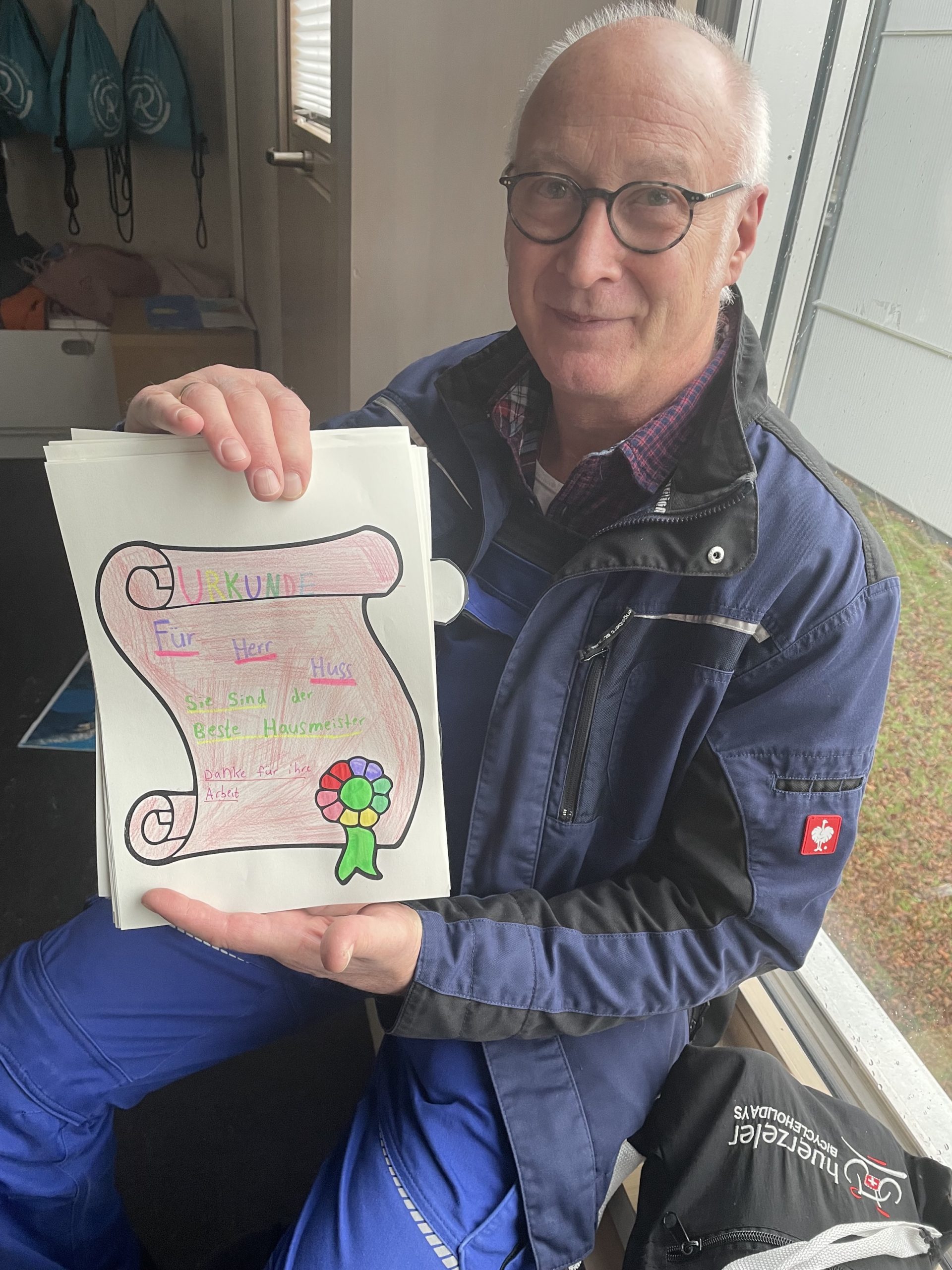 Zum Abschied gab es für den allseits beliebten Hausmeister mit dem verschmitzten Lächeln drei besondere Überraschungen: Unsere Schülerinnen und Schüler überreichten ihm selbstgemachte „Ehrenurkunden“, das Kollegium sang ihm ein selbst gedichtetes Ständchen und – last but not least – wurde der Multifunktionsraum kurzerhand in „Andreas Huß-Arena“ umbenannt. Der „Ruheständler“ zeigte sich gerührt und betonte, er gehe „mit einem lachenden und einem weinenden Auge“. Für ihn bleibe nun endlich mehr Zeit für die Familie und das bald erwartete zweite Enkelkind, aber die Arbeit in Aspe – besonders wegen der guten Zusammenarbeit mit seinem Teamkollegen Gerrit Dettmer und dem freundschaftlichen Umgang mit dem Kollegium – werde ihm sicherlich auch ein bisschen fehlen…