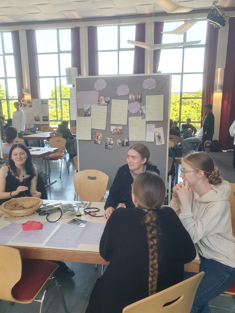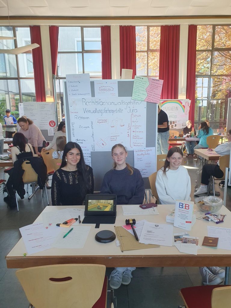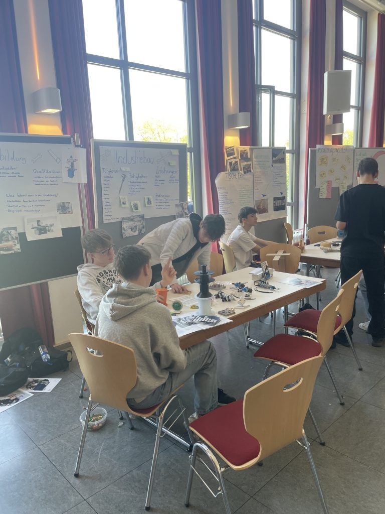 Spannende Praktikumswochen erlebten unsere Neuntklässler*innen vor den Osterferien. 14 Tage lang erkundeten sie in einem Berufsfeld ihrer Wahl die Arbeitswelt und wurden dabei von ihren Politiklehrer*innen begleitet, die ihnen in ihren Betrieben auch einen Besuch abstatteten. Nach den Ferien wurde diese besondere Erfahrung in einem ganztägigen Projekttag aufgearbeitet und eine Praktikumspräsentation erstellt, die anschließend allen achten Klassen in der Schulaula vorgestellt wurde. Zu den Berufsfeldern, die mit einem Plakat und einer kleinen praktischen Vorführung präsentiert wurden, gehörten unter anderem Industrie und Handwerk, medizinische Berufe und Berufe aus dem erzieherischen Bereich. Für die Achtklässler*innen war der Besuch dieser kleinen „Jobmesse“ eine tolle Möglichkeit, sich vor der Wahl ihrer Berufspraktika im nächsten Schuljahr Tipps aus erster Hand zu holen!
