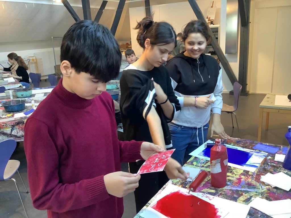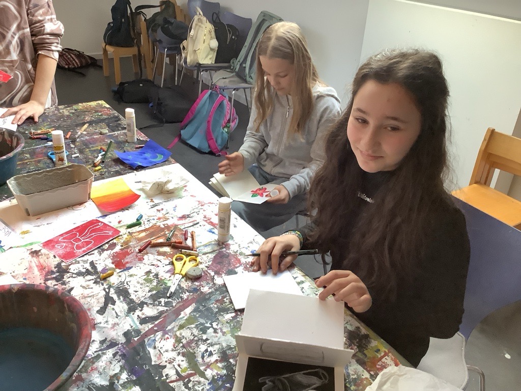 Im Eingangsbereich wurden wir von den Mitarbeiterinnen des Museums sehr freundlich empfangen. Zunächst wurden wir nach ganz oben ins Atelier geführt, wo schon vorbereitete Arbeitstische und viel Material auf uns wartete. Aus einem großen Bogen Papier falteten und klebten wir ein Leporello. Das ist ein kleines Buch in Zieharmonikaform. Bevor wir es gestalteten, sollten wir uns Anregungen in der Ausstellung holen.