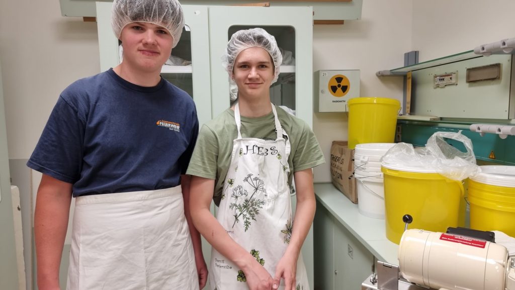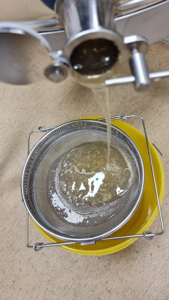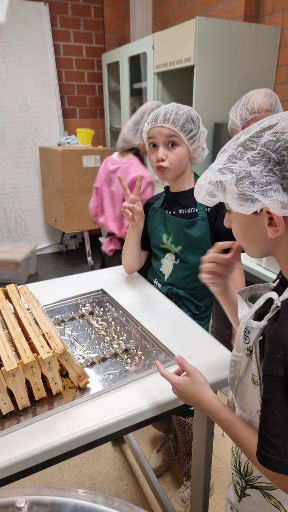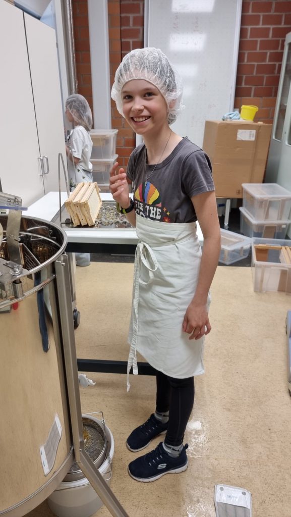 Wenn im Jahreszeitenkalender das Honigschleudern auf dem Programm steht, wird es für das Team der Natur-AG richtig spannend. Jetzt nämlich ist der Zeitpunkt gekommen, um das süße Naturprodukt, das unsere „Asper Bienchen“ produziert und in den Waben ihres Bienenstocks gelagert haben, zu „ernten“. Dafür brauchen die elf Fünftklässler*innen, die von Ben und Matthis aus Jahrgang 9 unterstützt werden, natürlich passende Arbeitskleidung und Haarnetze. Zunächst muss die Wachsschicht, mit der die Waben verschlossen sind, entfernt werden. Dann fließt der Honig durch ein Doppelsieb und im Anschluss noch durch ein Spitzsieb, damit alle Wachsteile herausgefiltert werden können. In einem Abfüllbehälter wird das Naturprodukt gerührt, dadurch verändern sich Farbe und Konsistenz – der Honig wird heller und cremiger. Anschließend wird der Honig abgefüllt, etikettiert und zum Beispiel bei Schulfesten oder am „Umwelttag“ in der Heerser Mühle verkauft.