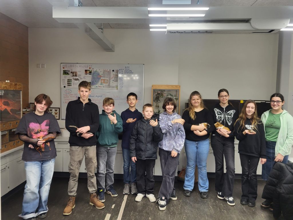 Für unseren „Aspe-Schulzoo“ sind Schüler*innen der Jahrgänge 7 bis 10 zuständig. Sie kümmern sich mit viel Liebe und Engagement um die tierischen Bewohner des Minizoos, zu dem neben Meerschweinchen, den großen Achadschnecken und Stabheuschrecken sogar auch drei amerikanische Kornnattern gehören. Die fleißigen Tierpfleger*innen sind nicht nur für das Füttern und das Reinigen der Gehege verantwortlich, sondern sorgen in der Pflegezeit natürlich auch für so manche Streicheleinheit.
