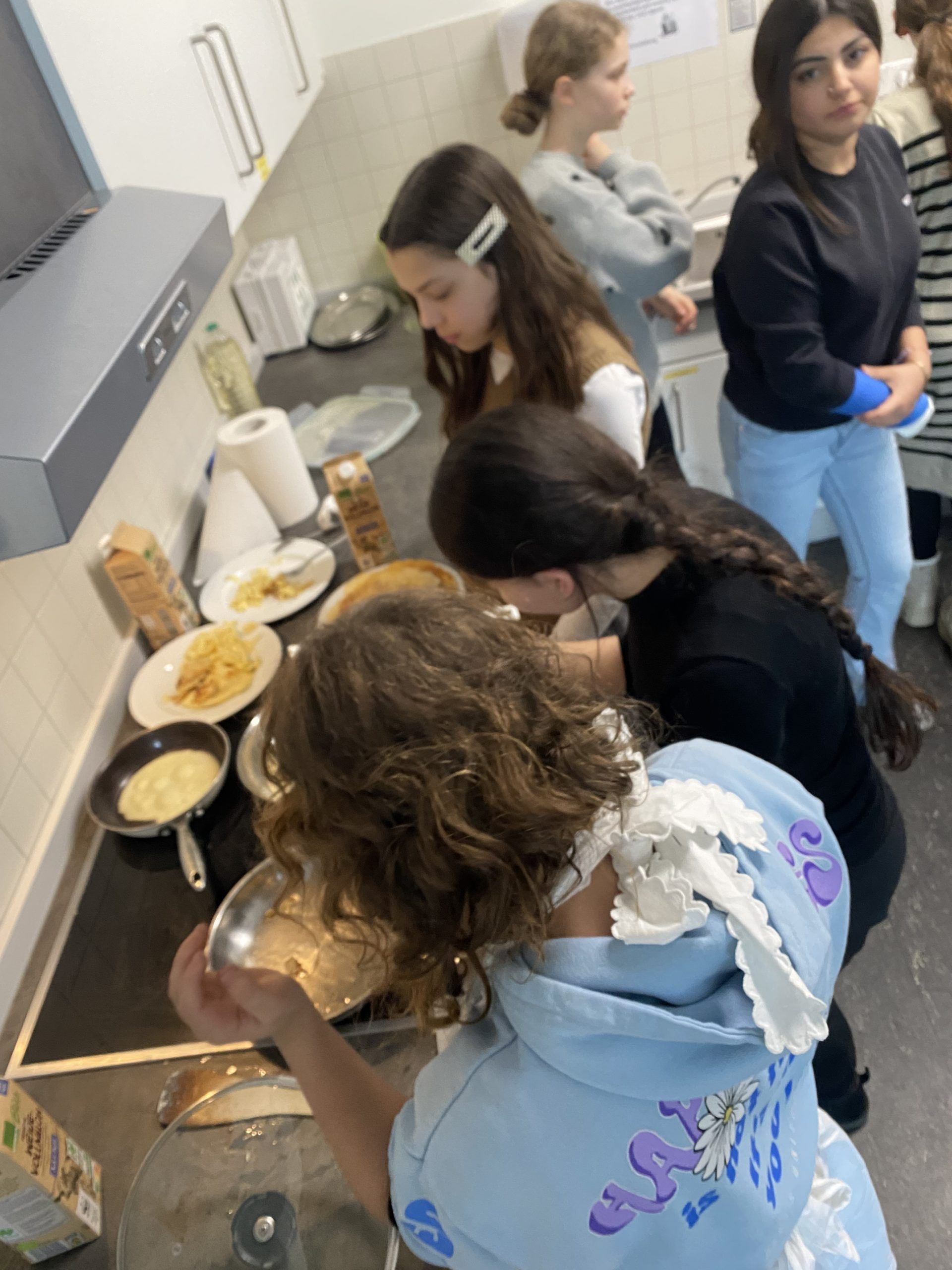 Schon am Morgen zog ein köstlicher Duft durch das Schulgebäude. In der Schulküche wurden fleißig Pancakes gebacken. Viele Schülerinnen und Schüler halfen beim Rühren des Teigs und beim Backen und Wenden der Pfannkuchen.