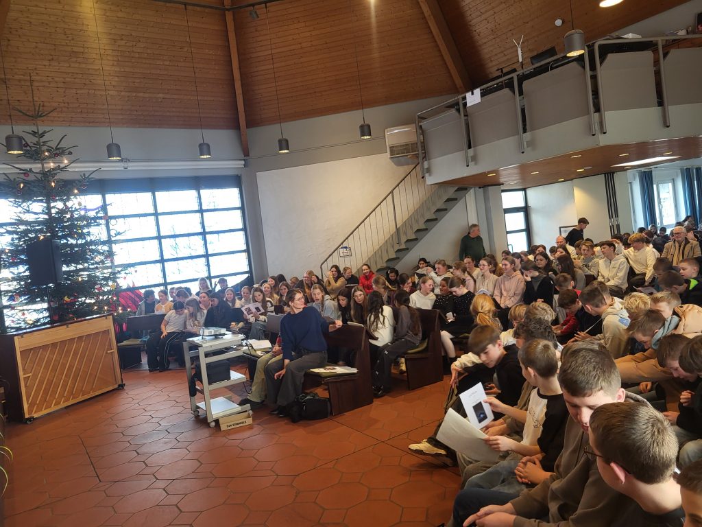Mit herzlicher Dankbarkeit richtet sich unser besonderer Dank an die Band und die Singgruppe der Schule für ihre wunderbare musikalische Unterstützung sowie an Herrn Pfarrer Graf für seine einfühlsamen Worte. Ebenso danken wir dem engagierten Vorbereitungsteam aus den Religionskursen der Jahrgänge 7 und 10 sowie den Religionslehrerinnen und -lehrern.  Der Gottesdienst war insgesamt sehr stimmungsvoll und die Schülerinnen und Schüler konnten viele wertvolle weihnachtliche Botschaften mit nach Hause nehmen .
